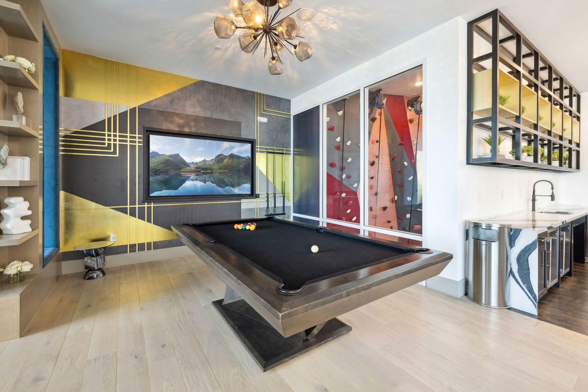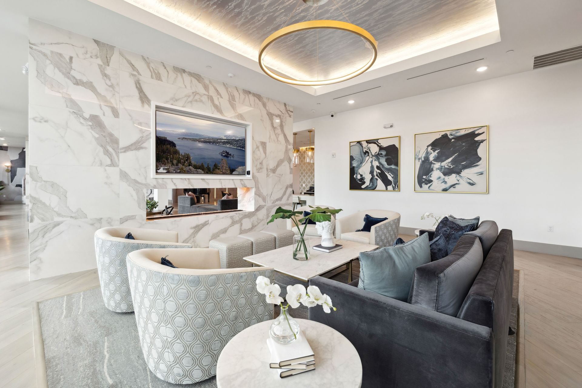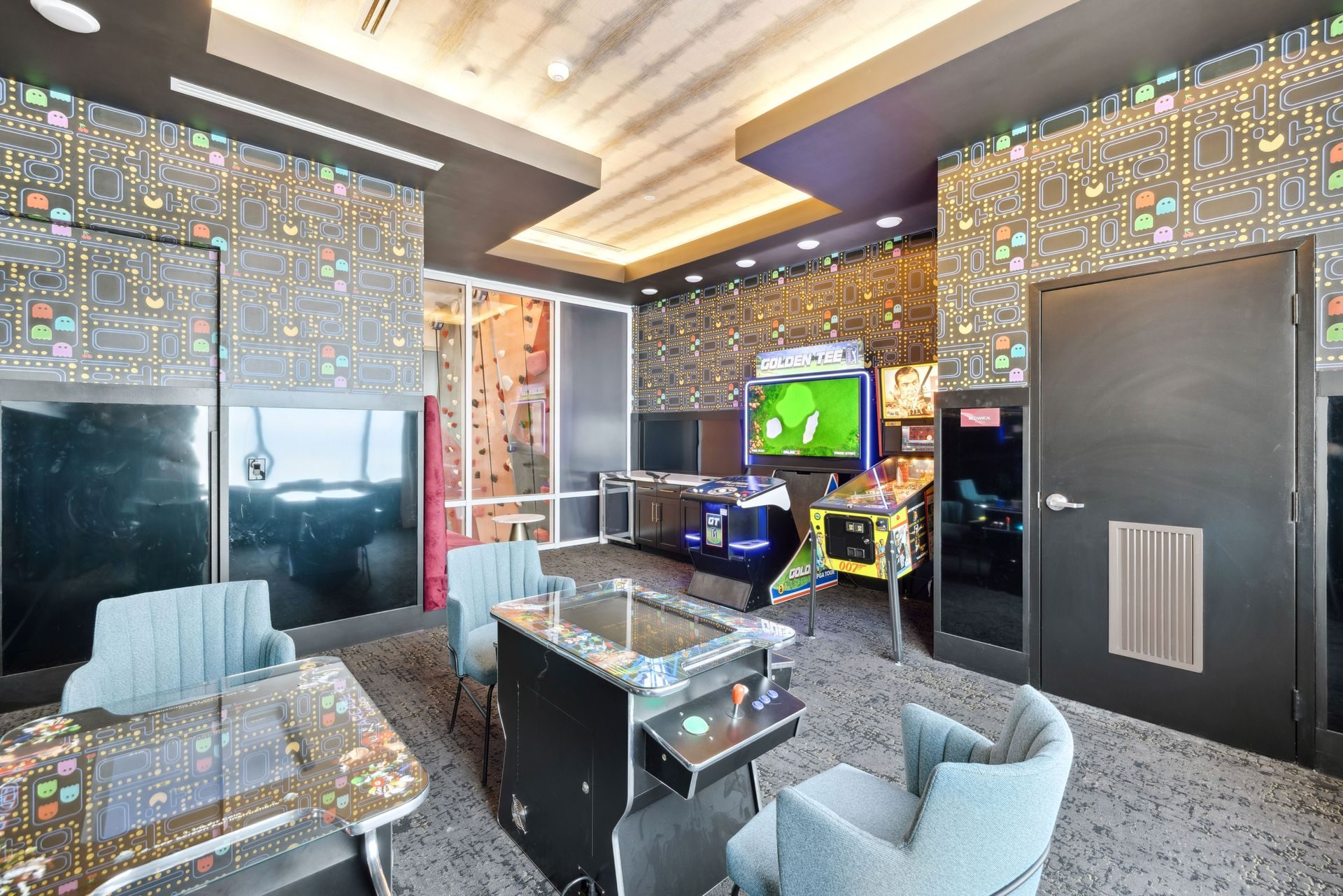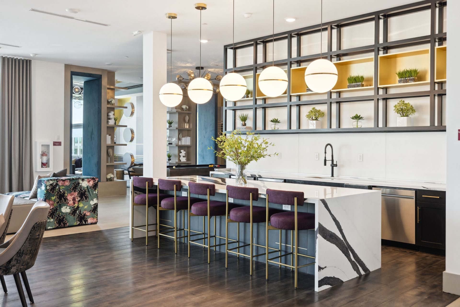The amenity sequence is organized as a series of interconnected destinations, social lounges, interactive entertainment spaces, and flexible gathering areas, each with a distinct identity while maintaining a cohesive design language. Layered seating, custom millwork, and sculptural lighting establish moments of intimacy within open layouts, supporting both casual daily use and larger social gatherings.