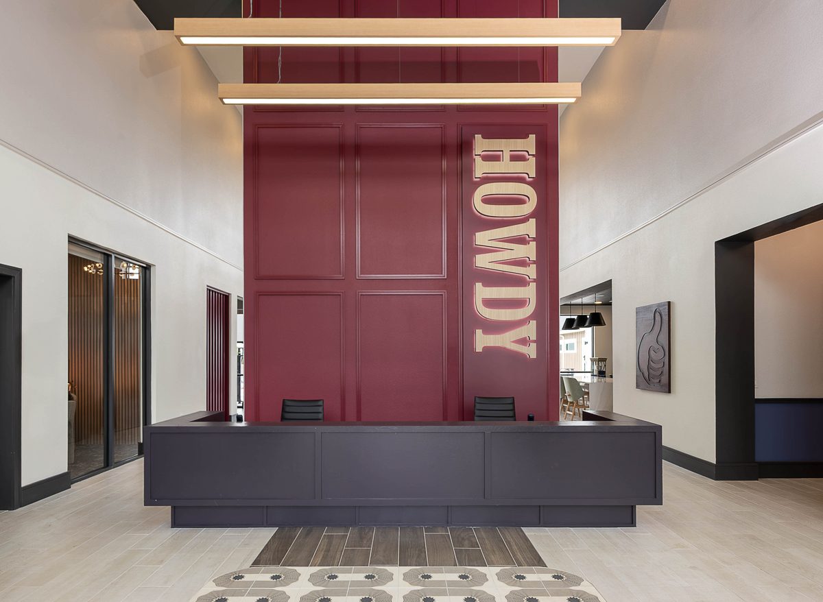 The bold “Howdy” entry wall sets the tone – a confident nod to connection and community. Multi-layered textures, unexpected details and playful iconography nod to all that Texas A&M embodies and artfully balances school spirit with wow-worthy moments.