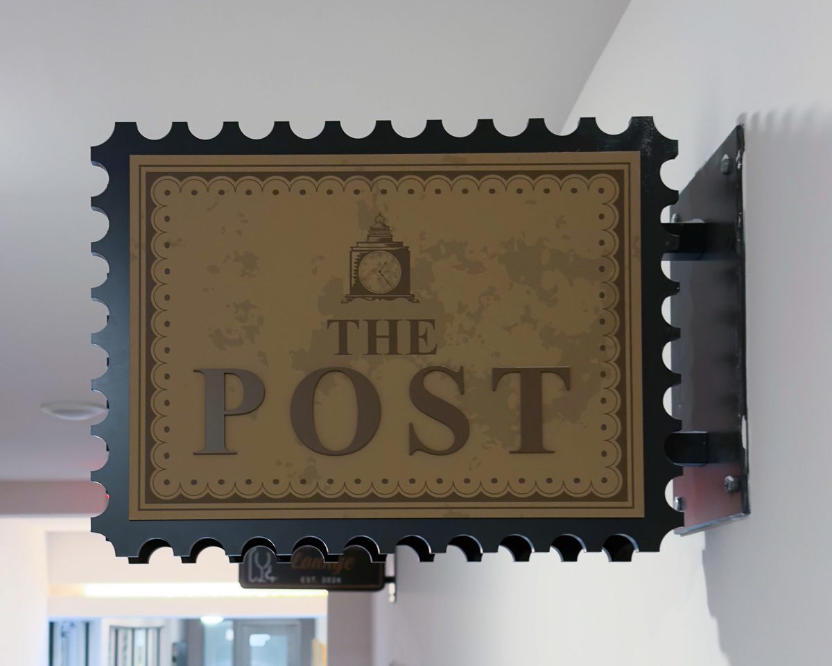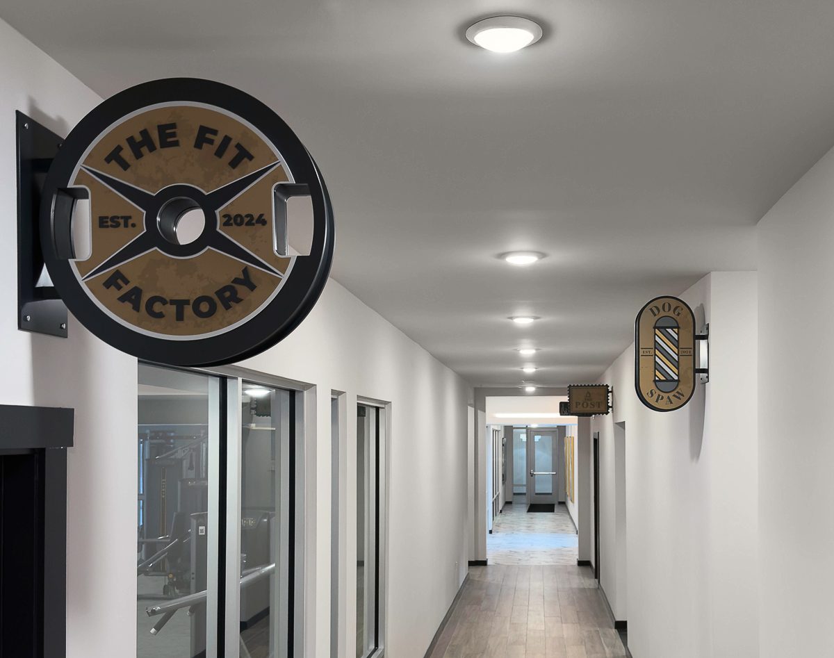 Custom signage and uniquely named wayfinding elements create a welcoming and memorable first impression and guide residents on a journey through each amenity space – from the Wine & Poker lounge, to “The Post” mailroom, and from the “Fit Factory” fitness zone to the “Dog Spaw” pet wash center.